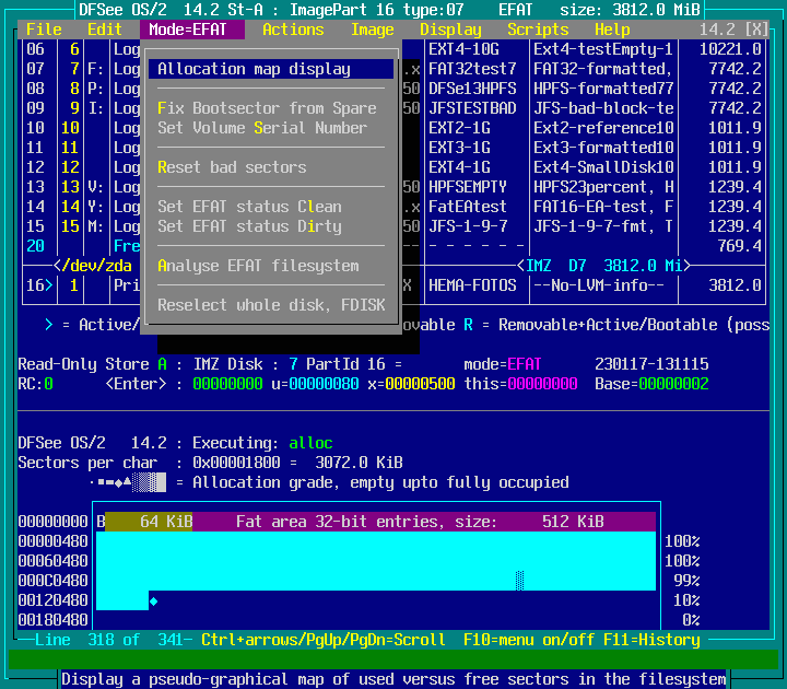 This will repair a broken EFAT bootsector (area) by replacing it with the spare-copy found at LSN 12 (0xC). This can be very useful when the bootsector got damaged by a virus or a crashing program (writing to sector 0) or if the partition was deleted by accident using FDISK or LVM and recreated again. The menu item is implemented using the 'bootsync -s' command, and in that process it will also recalculate the boot-area CRC values. - - - - - - - - - - - - - - - - - - - - - - - - - - - - - - - - - - - - - - - - - - Press <F1> again for more help; Some options may require switching to 'Expert mode'