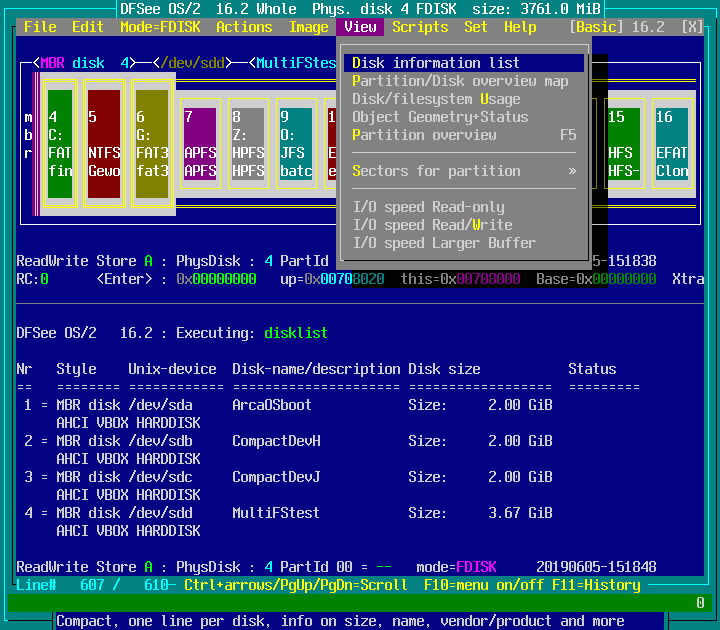 This will display a compact list of all attached disks using the 'disklist' command For each disk one line of information with names, sizes and other optional info like vendor/product names is displayed. This is very useful to IDENTIFY each disk uniquely, for example before doing a clone, image-resore or partitioning operation. Note that a 'disk' can be any partionable media supported by DFSee, like physical disks, virtual-disks and others ... - - - - - - - - - - - - - - - - - - - - - - - - - - - - - - - - - - - - - - - - - - Press <F1> again for more help; Some options may require switching to 'Expert mode'
