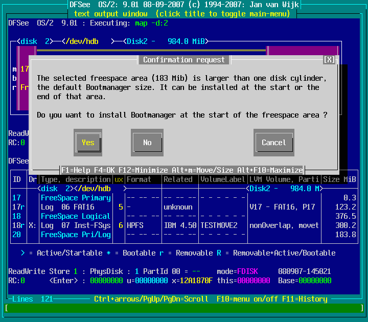 Mode=FDISK -> OS/2 LVM and BootManager -> Bootmanager Install : screenshot 2