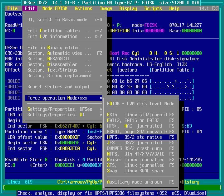 Edit -> Force operation Mode=xxx -> HPFS, OS/2 std native FS : screenshot 2