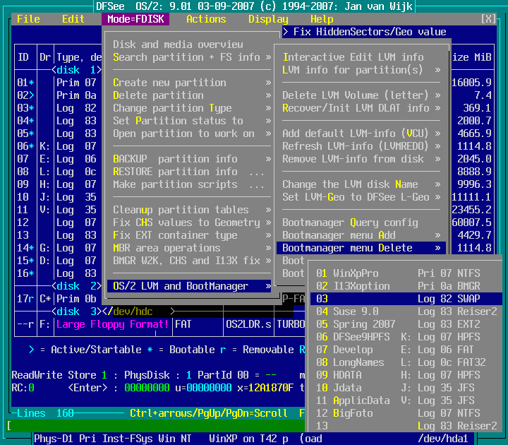 Mode=FDISK -> OS/2 LVM and BootManager -> Bootmanager menu Delete : screenshot 1