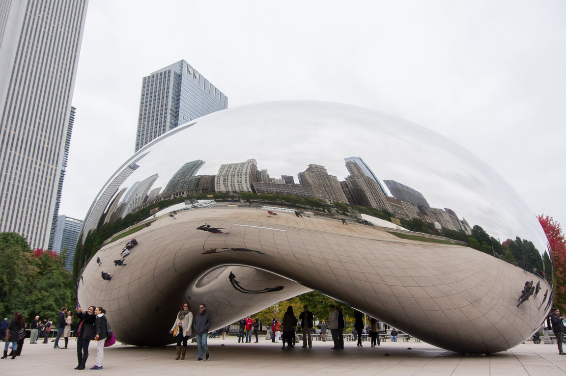 Almost surreal in its curved reflection of downtown Chicago and the people arround, this is the 'Cload Gate' sculpture in the Millenium Park, Chicago