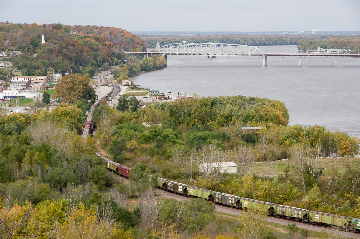 Overview of Hanibal Missouri, with two Mississippi river bridges and a long freighttrain passing through