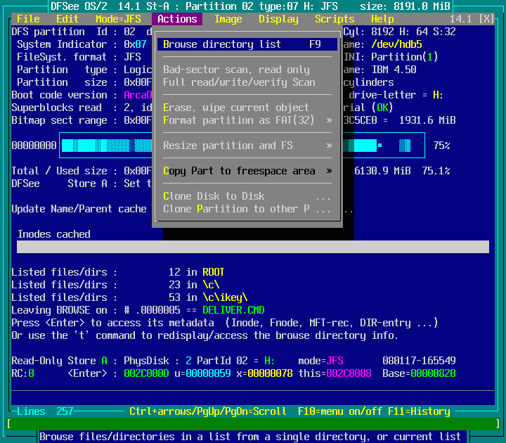 This will show the contents of a single directory, specified by a PATH from the ROOT directory, or by selecting a directory from the browse list itself (including the '..' directory). Alternatively, the CURRENT contents of the sectorlist can be browsed, when available (by specifying a '.' for the directory The list can be browsed in an interactive dialog, a bit like a regular filemanager. The dialog will allow 'actions' to be performed on the listed files/directories, using <ENTER> to get the popup menu: - View contents, as ASCII on File/Dir - View as x86 Assembler - disassembly - HEX-edit, contents only on File/Dir - Edit Contents, autoview on File/Dir - View OS/2 EA or Xattr on a File/Dir - Edit DATA area sectors for File/Dir - Edit META:Inode/Fnode/MFT/Dir-entry - Edit the base filename for File/Dir - Copy/Recover File(s) to other drive - Reduce list to SELECTED files only When the browse session is ended (<Esc> or <F3> key): - the SAME filesystem/partition stays selected You can restart browse the same partition with the <F9> key, or start browsing another partition from the Actions menu using: 'Actions -> Open Partition, Browse FS' - the sector-list contains the last browsed directory and can be viewed with commands like 'list -f - The last entry (file) that was selected will also be set as the current sector-location ('this'), so it easy to analyse that furthher, for example by using the HEX-editor that can be started with <F2>, or simply by viewing the sector using the <Enter> key. Note: When working in 'mode=FDISK' (with a whole disk opened) you will be presented with a selection-list to pick a partition with a filesystem first. - - - - - - - - - - - - - - - - - - - - - - - - - - - - - - - - - - - - - - - - - - Press <F1> again for more help; Some options may require switching to 'Expert mode'