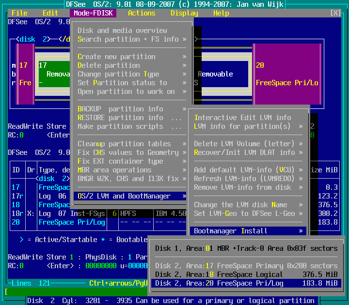 Mode=FDISK -> OS/2 LVM and BootManager -> Bootmanager Install : screenshot 1