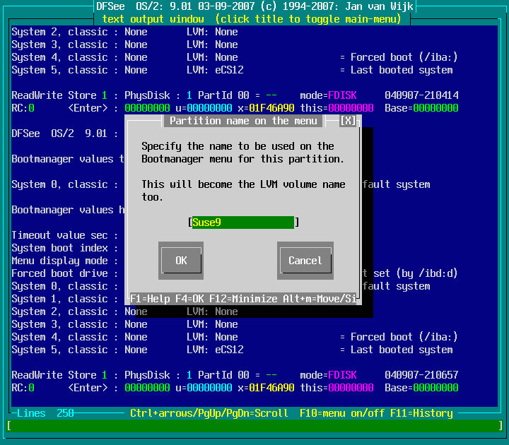 Mode=FDISK -> OS/2 LVM and BootManager -> Bootmanager menu Add : screenshot 4