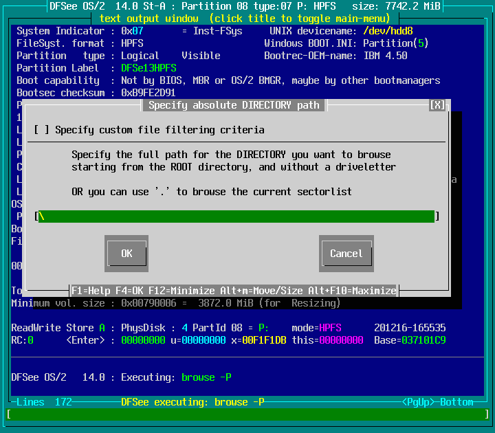 Mode=HPFS -> File Find/Recover/HEXedit -> Browse FS, directory/files F9 : screenshot 3