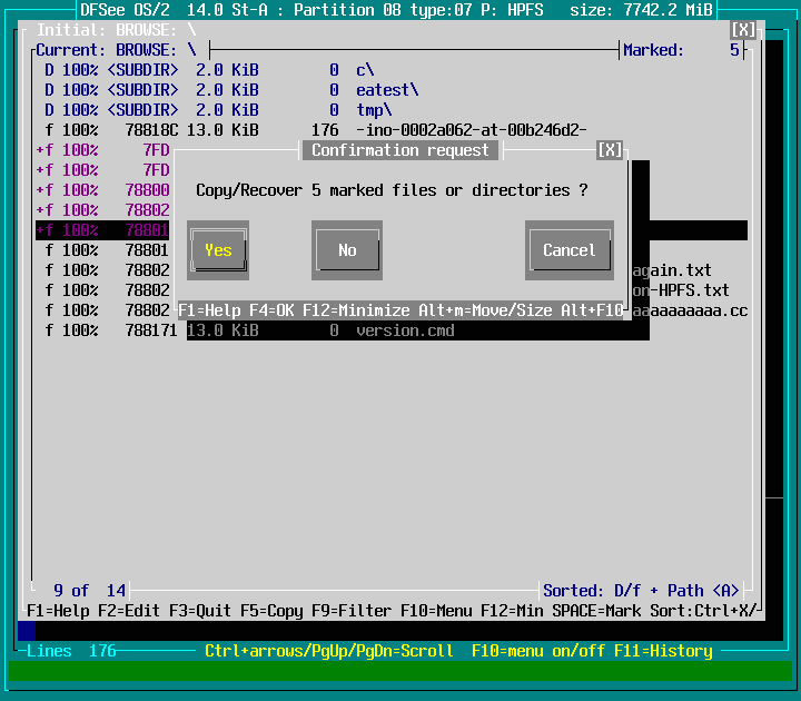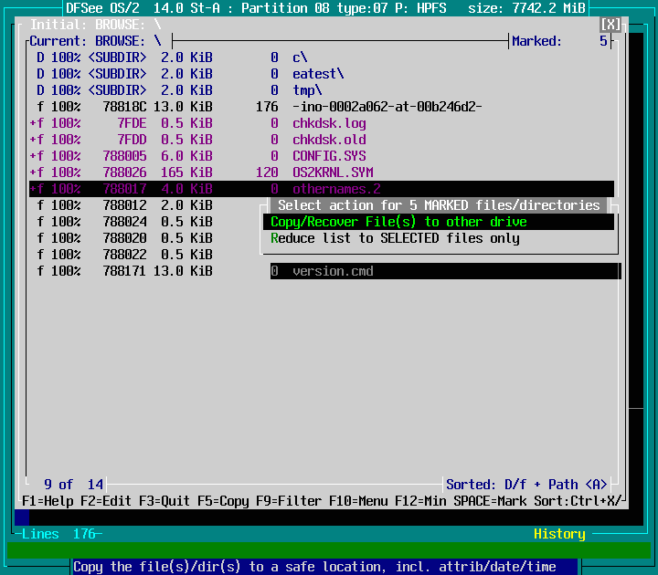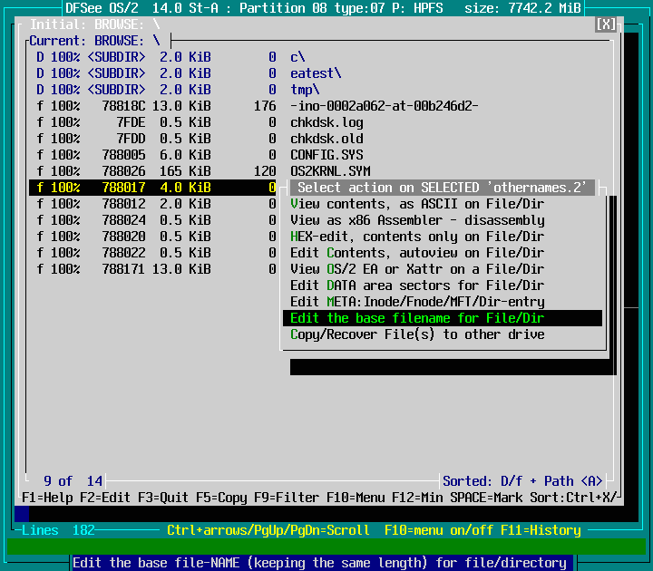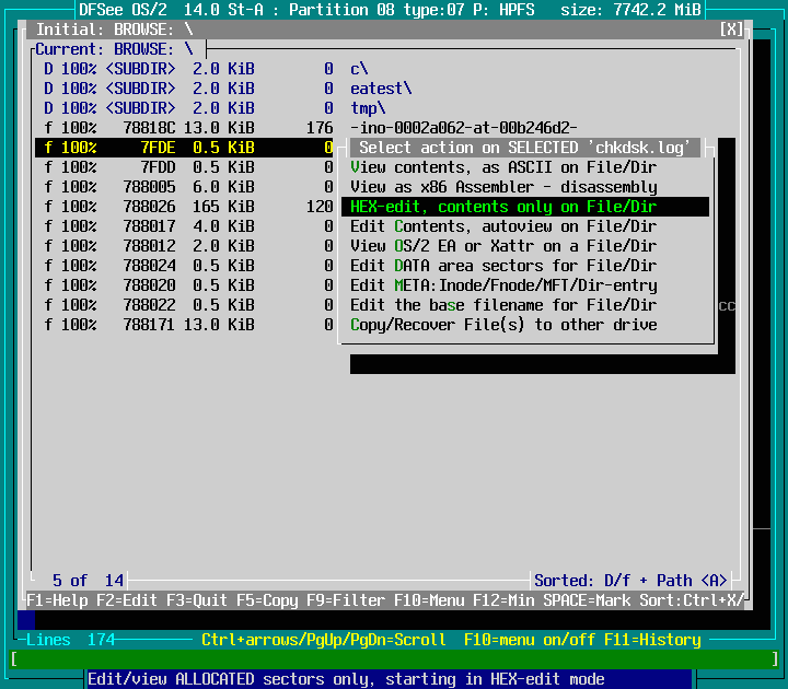 Mode=HPFS -> File Find/Recover/HEXedit -> Browse FS, directory/files F9 : screenshot 9