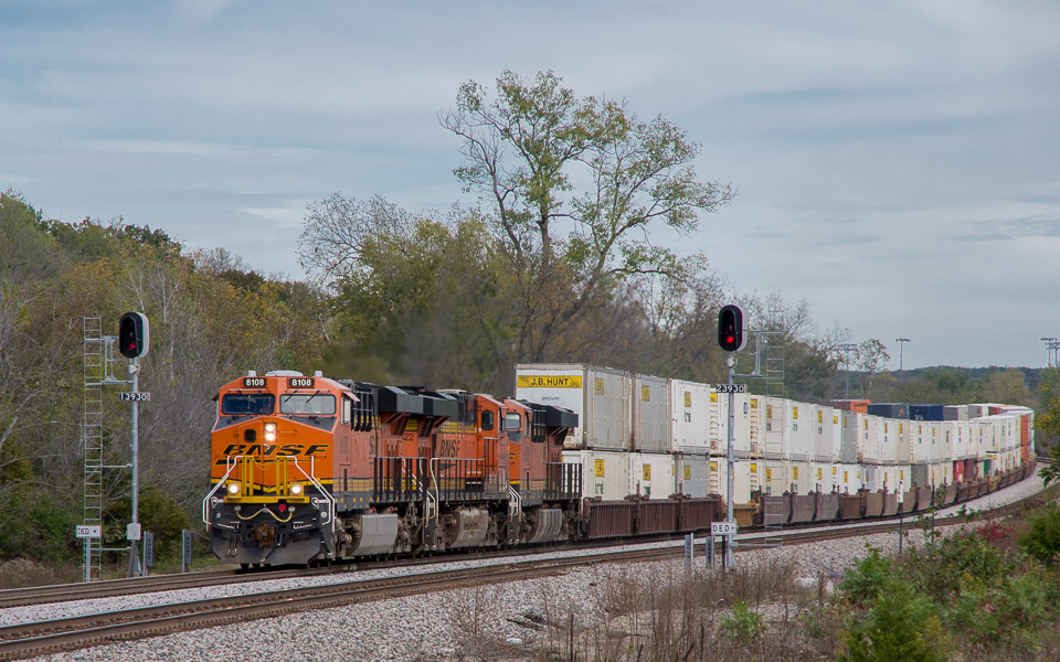 A dual engine BNSF freighttrain alongside route 66 near Sequoah, Oklahoma
