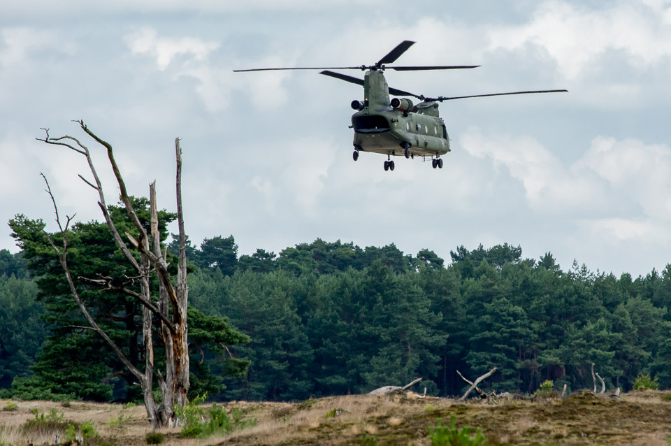 Februari 2018, A Dutch Boeing CH-47 Chinook helicopter in a low flying action over 'De Veluwe' NP